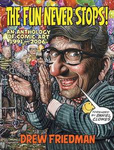 The Fun Never Stops is a comprehensive collection of premier caricaturist Drew Friedman's best comic strips, illustrations, and mug shots dealing with all the familiar Friedman themes the world has come to love: showbiz has-beens, ugly old white men, nefarious politicians, debauched celebrities, the ubiquitous Lord of Eltingville, etc. Most of the work is from the 1990s, and show Friedman's gradual phasing out of his famous (and amazing) black-and-white stipple look to his current (and equally amazing) lush watercolor style. In addition to the works written by Friedman, Fun includes many collaborations with his longtime partner K. Bidus, as well as Harvey Pekar (American Splendor), Mark Newgarden (We All Die Alone), and Bruce Handy, among others. Also included is artwork from the notorious Topps Bubble Gum Card series Toxic High, as well as art from the card sets Beauties and Cuties and Ed Wood Players. Comic strip highlights include "Everybody's Buddy" (RAW), which examines the legendarily combustible temper of drummer Buddy Rich; "Where's Johnny?" (Entertainment Weekly), a journey into what would have become of Johnny Carson's career had he never hosted the "Tonight Show"; "Hey, Academy!" (NY Observer), a demand from Friedman that Jerry Lewis be awarded a lifetime achievement award by the Motion Picture Academy; "The 10 Least Powerful People in Hollywood" (Details); "Howard Stern & Al Sharpton run for political office in NY" (The New Yorker); and "Kasablanca" (Esquire), which imagines Casablanca as directed by Oliver Stone. The book is topped off with a detailed, career-spanning biographical introduction by Ben Schwartz and a foreword by Daniel Clowes.